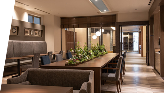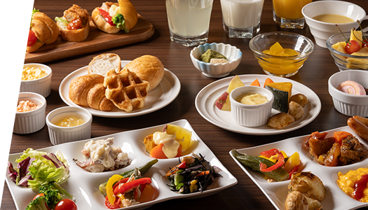 朝食には、地元食材を積極的に採用した和洋ビュッフェを提供しています。朝食後は、会場をコワーキングスペースとして深夜0時まで開放。フリーWi-Fi完備です。