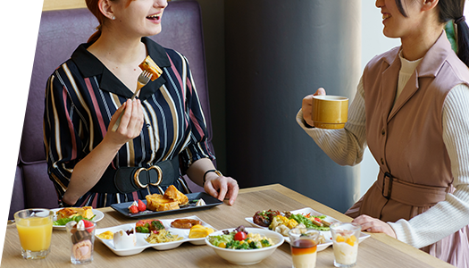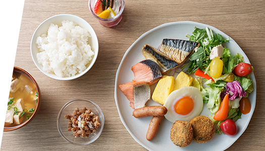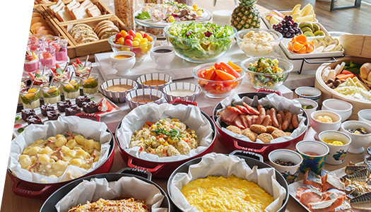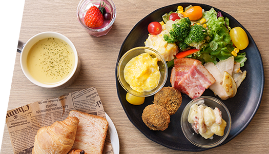 2F ビスタカフェでは、たっぷりの野菜とフルーツに、塩麹や豆乳といった腸内環境を整える食材を取り入れた「腸内健康朝食」ビュッフェを提供しています。